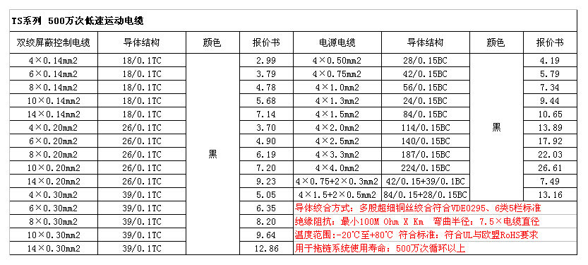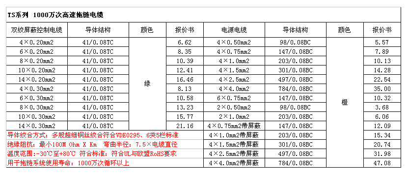 芯線絞合成纜:在室溫下具有極佳的抗酸、堿,適用于無強應(yīng)力緩釋或強制引導(dǎo)和油脂等特性符合DIN47100色標(biāo)的自由連續(xù)往復(fù)運動下的安裝及固定敷設(shè)ROBOTFLEX采用特殊耐油PVC混合耐磨外護(hù)套多股細(xì)絞成束銅絲和較小成纜節(jié)距,并在纜芯內(nèi)加入足夠的抗拉纖維。